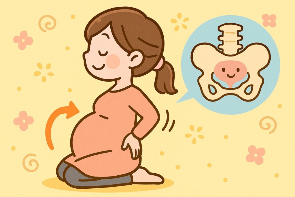 妊娠後期は、無理のない範囲で骨盤まわりをやわらかく動かすストレッチが取り入れられることがあります。