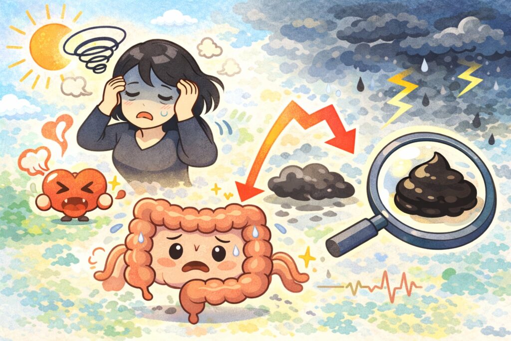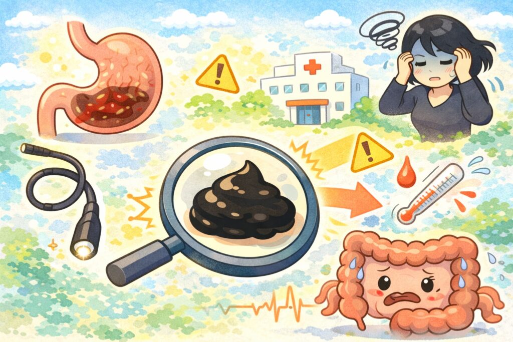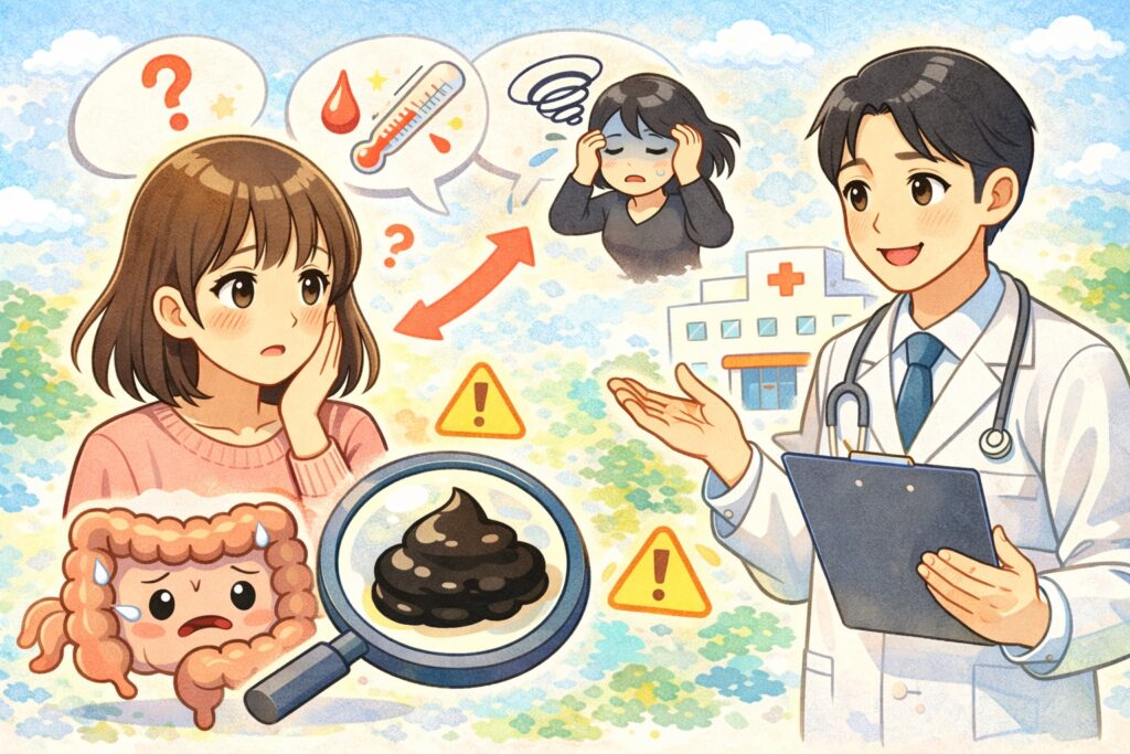 胃や十二指腸など上部消化管からの出血が関係している可能性があると説明されることがあります。