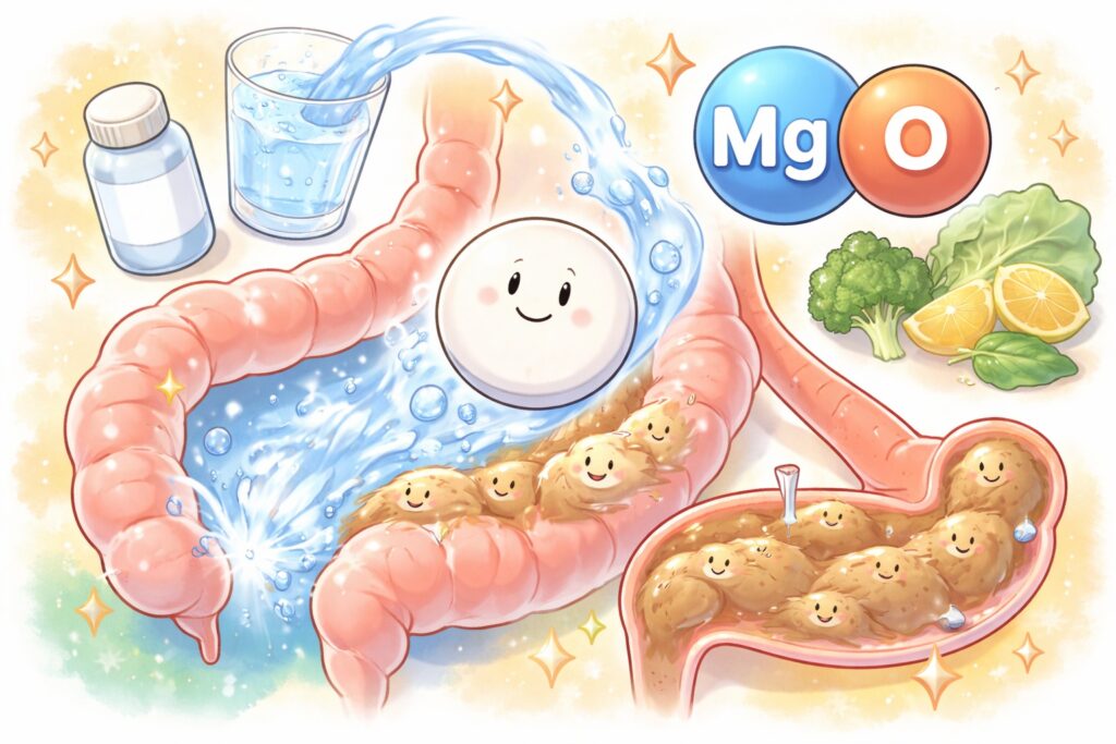 酸化マグネシウムは腸の中で水分を集め、便をやわらかくする方向に働きます。