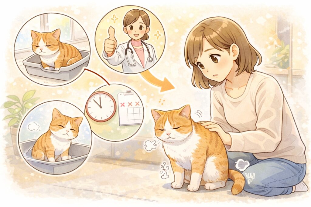 「猫の便秘は、早めに相談してくれたほうが結果的に負担が少ないことが多いですよ」と。